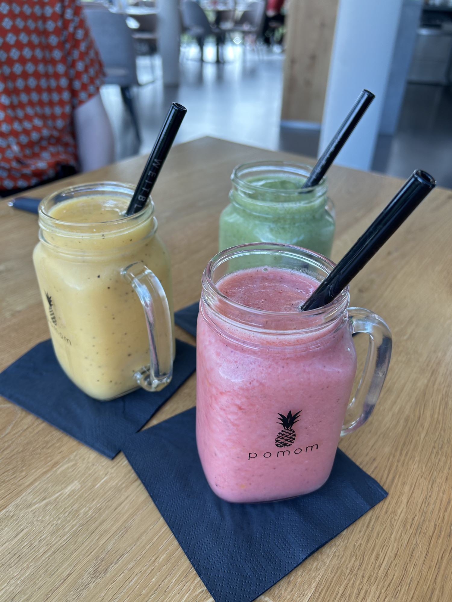 Schnell haben wir gewählt: Für meine Begleitungen gibt‘s ein Brötchen-Käse-Frühstück mit Gemüse- und Obst-Highlights, ich wähle das Shakshuka, über das ich mich beim Lesen der Karte ungemein freue. Genauso groß ist nach dem ersten Schluck meine Begeisterung über die Smoothies, meiner glänzt mit dem Mix aus Ananas, Banane, Mango und Spinat. Ein großer Sip durch den Strohhalm – einfach überragend, einfach fruchtig.